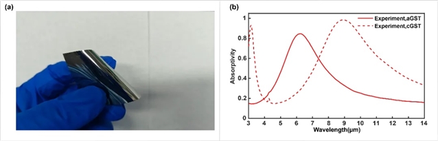 团队利用磁控溅射镀膜技术成功制备了红外隐身薄膜样品,并通过傅里叶变换红外光谱仪测量了当GST处在不同状态下薄膜的吸收谱,如图2所示。与理论研究结果相一致,通过切换GST的不同状态,薄膜可以在红外隐身和非隐身状态之间切换,展现了其在红外隐身应用中的灵活性与实用性。