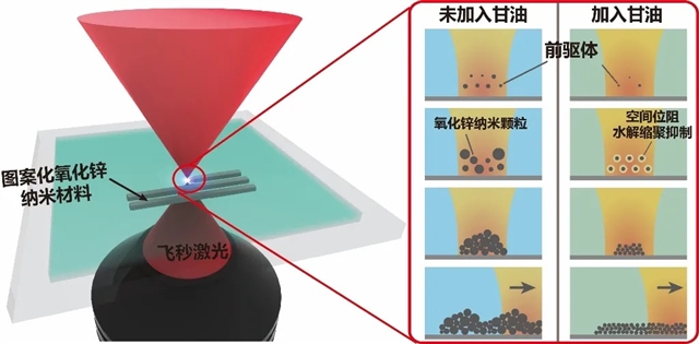 图1:飞秒激光直写氧化锌纳米材料及甘油晶粒调控示意图