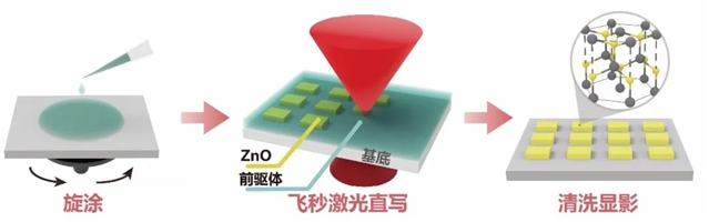 氧化锌纳米材料因其独特的物理化学性能,广泛应用于光电子、传感器及催化等领域。然而,如何高效、精准地制备图案化氧化锌纳米材料一直是科学家们面临的难题。传统制备技术往往需要复杂的后续转移组装步骤,或精度有限,流变性要求苛刻的溶液成形技术。此外,已有的激光直写技术虽然具有无掩模和单步合成+图案化的优势,但是其多采用纳秒或连续激光,热影响区大,需要金属或碳基光热转换层,这在一定程度上限制了器件的小型化与集成度。