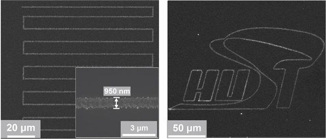 研究人员制备了一系列二维图案化氧化锌纳米材料产物,例如弓形线和“HUST”标志,如图3所示。
