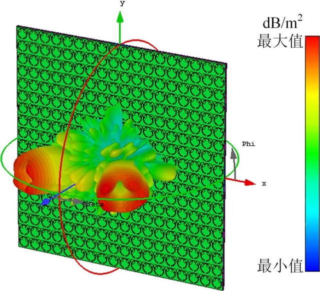 对于涡旋波束方案,假设拓扑电荷为±2,在不同的通道中设置不同的波束偏转角度。正交圆极化波共极化反射通道中的偏转角度为30°,正交线极化波共极化反射通道中的偏转角度为24°,正交线极化波交叉极化反射通道中的偏转角度为18°。以左旋圆极化波共极化反射通道为例,超表面的编码序列以及三维远场散射模式示意图分别如图4、图5所示。