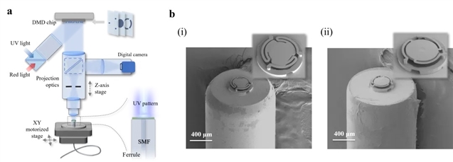 在完成对传感器上层结构的数值模拟计算和优化分析后,研究小组采用自建的数字化紫外光(UV)曝光平台,运用光学3D微打印技术制备该光纤加速度计。如图2a所示,该光学3D微打印系统主要包括:一个高功率紫外光源(波长为365 nm)、一个用于动态生成曝光图案的紫外级数字微反射镜(DMD)、一套用于投影的光学组件、一个用于机器视觉定位的数字相机,以及一组高精密电动XY位移平台及用于光学对准的高精度垂直位移平台等。由于SU-8树脂具有很好光学性能,包括在可见光和近红外范围内的高透明度,以及出色的机械强度和耐化学性,研究小组选用SU-8树脂来3D微打印制造该微型光纤加速度计。通过对打印工艺技术的进一步改进和优化,研究小组成功在光纤陶瓷插芯端面上原位3D微打印出了集成有惯性质量块的微型FP干涉式传感头,制造出直径约为400微米的微型光纤加速度计。图2b展示了所制备的加速度计传感头扫描电子显微镜(SEM)图像。从图中可以看出,所制造出的加速度计传感头结构几何形态完整,表面光滑,上层3D微机械结构垂直悬挂在三瓣底座之上。