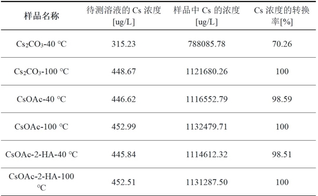 表1:通过在不同温度下将Cs2CO3和CsOAc与ODE、OA或2-HA混合制成的各种铯源前体的Cs浓度的对比表
