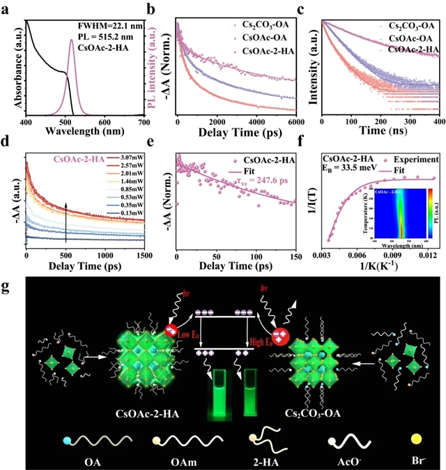图2:(a)CsOAc-2-HA量子点的PL-UV谱线;Cs2CO3-OA,CsOAc-OA和CsOAc-2-HA量子点的(b)瞬态吸收光谱和(c)TRPL光谱;CsOAc-2-HA量子点的(d)基态漂白的功率依赖动力学轨迹、(e)双激子俄歇复合衰减曲线和(f)温度依赖PL光谱;(g)2-HA配体的钝化量子点的工艺示意图