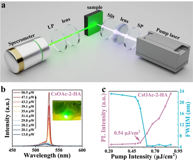 图3:(a)CsPbBr3量子点ASE测量的光学装置;(b)CsOAc-2-HA量子点的泵浦密度与发光强度的相关光谱;(c)CsOAc-2-HA量子点的发射强度和半峰宽与泵浦激光强度的关系。