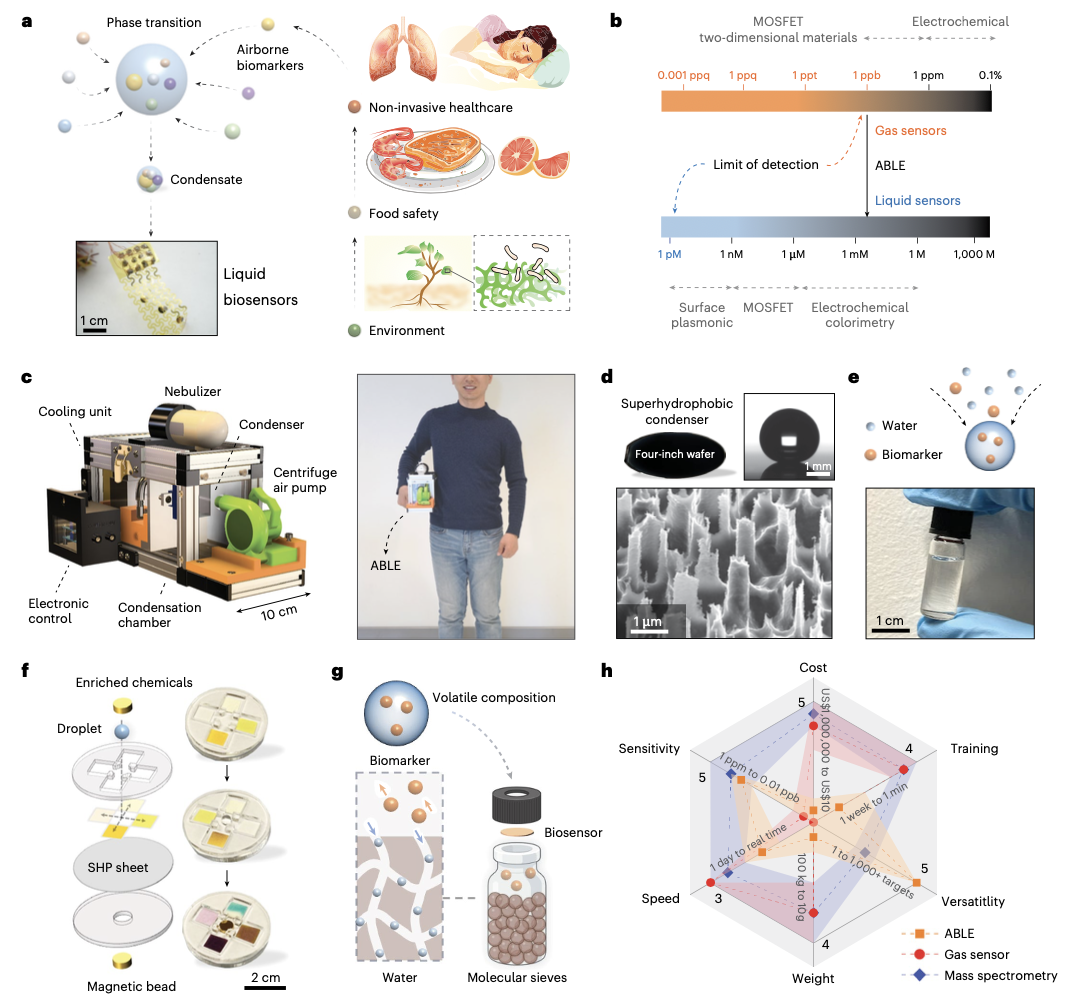 该研究开发的ABLE平台通过创新气相-液相转换技术实现了空气中痕量生物标志物的高效检测,其核心优势包括:1) 检测灵敏度可较传统传感器提升高达9个数量级;2) 多目标兼容性(可同步检测VOCs、非挥发性分子及颗粒物);3) 实用化设计(便携设备成本<200美元,15分钟完成检测)。关键技术突破在于采用超疏水冷凝表面(冷凝效率提升150%)和分子筛/蒸发双重富集技术,已成功应用于呼吸代谢物监测、早产儿炎症标志物筛查和空气病原体检测等领域。目前,研究团队正进一步推动ABLE的发展和多领域应用。(来源:科学网)