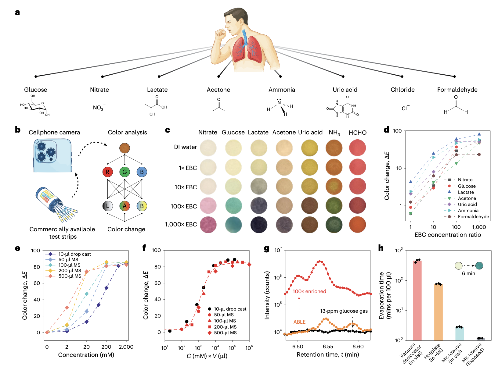研究团队基于人工呼气冷凝液(EBC)模型,创新性地开发了"空气采样-液滴捕获-比色检测"一体化工作流程。作者同时就挥发性与非挥发性分子的二次富集提供了技术路线,使非专业用户也能在家获得可靠的检测结果。
