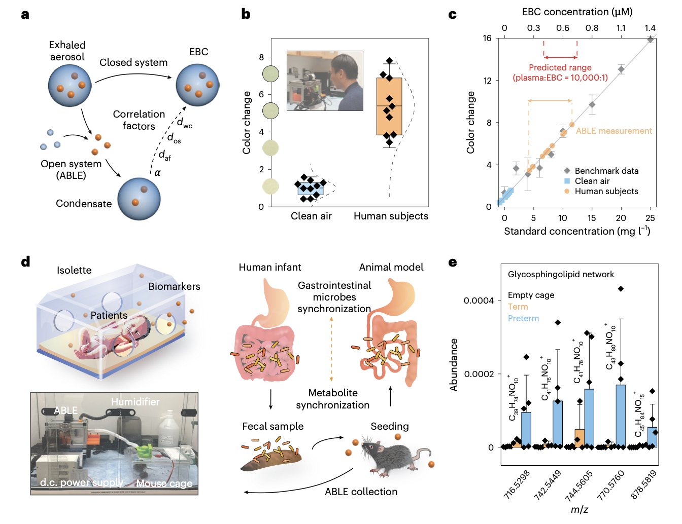 研究团队首先建立了空气中生物标志物稀释因子的校正模型,并基于此模型设计并进行了人体实验和早产儿动物模型来验证ABLE无创检测人体呼出物成分的性能。