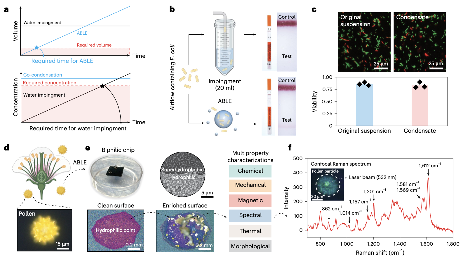 近日,美国芝加哥大学化学系田博之团队与医学院Erika Claud团队开展跨学科合作,共同开发了基于气相-液相转换的ABLE检测平台,通过创新传热传质过程实现了空气中标志物的快速富集,从而可以在未来实现快速、便捷、灵敏的空气检测技术。2025年5月21日,该工作以“Airborne biomarker localization engine for open-air point-of-care detection”为题,发表在Nature Chemical Engineering期刊上。前田博之团队的博士后,现美国圣母大学航空机械系、生物工程系的马景铖助理教授为文章的第一作者以及共同通讯作者。