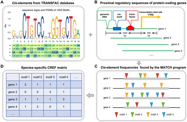 图1:构建 CREF 矩阵的流程图。A.选择顺式元件数据库。本研究选择TRANSFAC 数据库的 1403 个顺式元件,它们由位置权重矩阵(PWM)表示,通过序列的 logo 可视化。B.提取蛋白质编码基因的近端调控序列。近端调控序列定义为转录起始位点(TSS)上游-1000 bp至下游+500 bp的区域。对于具有多个注释转录本的基因,选择其5’端最上游转录本的起始位置作为 TSS。C.搜索近端调控序列中的潜在顺式元件和转录蛋白结合位点。本研究使用MATCH 程序进行搜索,阈值参数设置为minFN(最小化假阴性)。D.构建物种特异的元件计数矩阵。将计数结果整理为以基因为行、元件为列的矩阵,称为顺式调控元件频数(CREF)矩阵。本研究的定量及系统生物学分析均基于该矩阵。