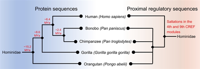 King 和 Wilson在1975年提出,生物表型差异的线索可能存在于基因调控之中。转录调控是一个涉及多环节的复杂过程,关键步骤是顺式元件与转录蛋白的相互作用。由于转录因子蛋白的结构在相近物种之间相对保守,顺式调控序列的改变被视作进化和适应的重要遗传基础。尽管这一观点得到了许多案例研究的支持,但至今仍然缺少一个能够解释人类与类人猿表型差异的系统性分子模型。