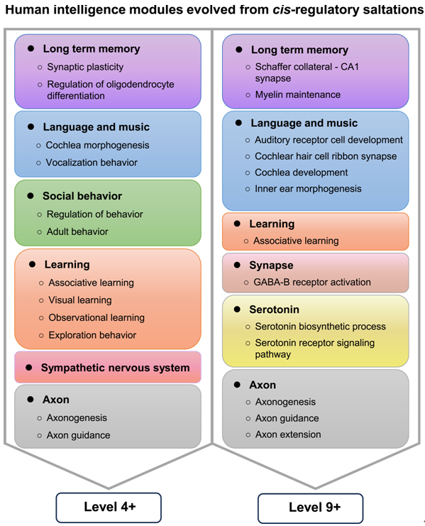 人类与黑猩猩可比对基因组DNA序列之间的分歧率仅为 1.23%。为了探索用基因调控解释二者的表型巨大差异,作者采用顺式调控元件频数(CREF)矩阵表征各物种的近端调控序列,并将每个 CREF 矩阵分解为双重特征模块。通过比较四种现存类人猿物种的 CREF 模块,作者从系统生物角度观察到调控元件在进化中的量变与质变。研究发现两个关键的跳变事件:一个发生在第 4 与第 5 特征水平之间,另一个发生在第 9 与第 10 特征水平之间。这些分子层面的跳变揭示了人类特有的认知与智力特征,包括:长期记忆,支持语言和音乐发展的特有耳蜗形态发生,维系和平共处与协作的社会行为,视觉 / 观察 / 联想学习能力。此外,作者还发现有:驱动创造力的探索行为,保护神经元的GABA-B 受体激活机制,调节幸福感的血清素生物合成 / 信号通路。在第 4/9元件特征向量上,Alu转座子携带的调控元件数量显著增加。尽管蛋白质序列进化遵循渐变模式,但基因调控可以通过模块跳变实现认知功能的跨越式进化。CREF 框架无需先验知识,即可从调控序列中解析出人类特有认知特征。为基因调控进化研究提供了新的量化范式。