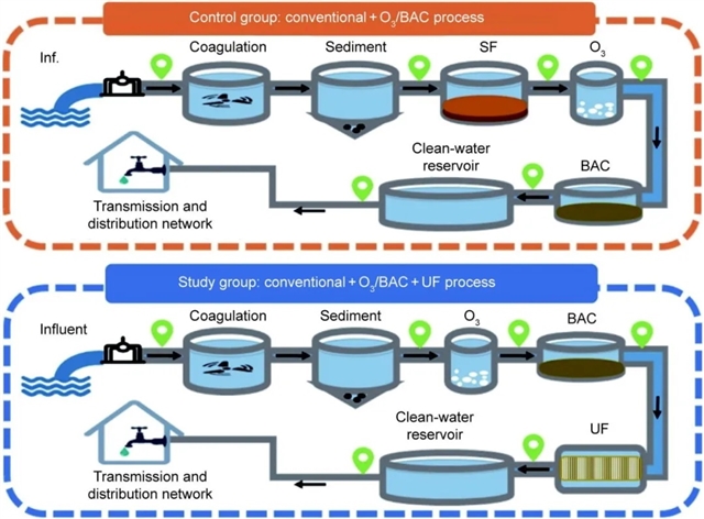 在此背景下,研究人员对中国上海4个饮用水处理厂进行了研究。他们将水厂分为两组,对照组采用常规处理工艺加臭氧/生物活性炭(O3/BAC)工艺,研究组则在此基础上增加超滤工艺。研究共检测了30种目标抗生素,其中17种在水样中被检出。结果显示,饮用水处理厂的深度处理工艺对目标抗生素的去除效果显著,出厂水中抗生素平均浓度相比原水降低约88%。