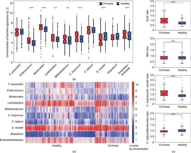 图1. 肝硬化患者与正常对照组的肠道菌群。(a)箱型图表示的肝硬化组和正常对照组中 10 种优势肠道菌种的丰度。纵轴表示 10 种菌丰度的对数值。箱体的上、下限表示第一四分位和第三四分位外 1.5 倍 IQR 内的最小和最大值。黑点表示在箱体之外的异常点。切口表示中位数的 95% 置信区间。(b)肝硬化组与正常对照组间 10 种优势菌种含量差异的热力图。水平轴表示肝硬化和正常对照组中的各样本。肝硬化组有 244 个样本,正常对照组有500 个样本。垂直轴表示样本中的 10 种优势细菌。不同的颜色表示每个样本中 10 种细菌的丰度的对数值。暗红色表示含量较高,暗蓝色表示含量较低。(c)肝硬化组与正常对照组之间肠道细菌的两两比值。* P < 0.05,** P < 0.01,*** P < 0.001。n.s.:无显著差异。