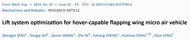 Shengjie XIAO(肖胜杰), Yongqi SHI(史永淇), Zemin WANG(王泽民), Zhe NI(倪喆), Yuhang ZHENG(郑宇航), Huichao DENG(邓慧超), Xilun DING(丁希仑). Lift system optimization for hover-capable flapping wing micro air vehicle. Front. Mech. Eng., 2024, 19(3): 19