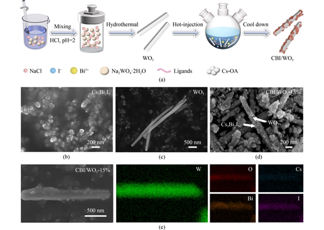 图1 (a) CBI/WO3合成过程示意图;(b) Cs3Bi2I9、(c) WO3、(d) CBI/WO3- 15%的SEM图像;(e) CBI/WO3- 15%的EDX映射图
