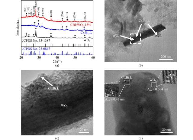 图2 (a) WO3、Cs3Bi2I9和CBI/WO3-15%的XRD图谱;(b和d) CBI/WO3-15%的高分辨透射电子显微镜(HRTEM)图像(c和d是从b中放大得到的)。