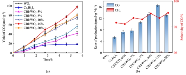 图3 (a) WO3、Cs3Bi2I9、CBI/WO3- 5%、CBI/WO3- 8%、CBI/WO3- 10%、CBI/WO3- 15%和CBI/WO3- 20%在6小时反应时间内光催化将CO2转化为CO的产率;(b) WO3、Cs3Bi2I9、CBI/WO3物理混合样品(CBI/WO3- mix)、CBI/WO3- 5%、CBI/WO3- 8%、CBI/WO3- 10%、CBI/WO3- 15%和CBI/WO3- 20%的光催化CO2还原性能比较