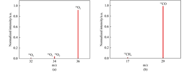 图4 (a) 光催化CO2还原耦合99% H218O氧化过程中产生的O2的质谱图;(b) 光催化¹³CO2还原过程中产生的CH4和CO气体的质谱图