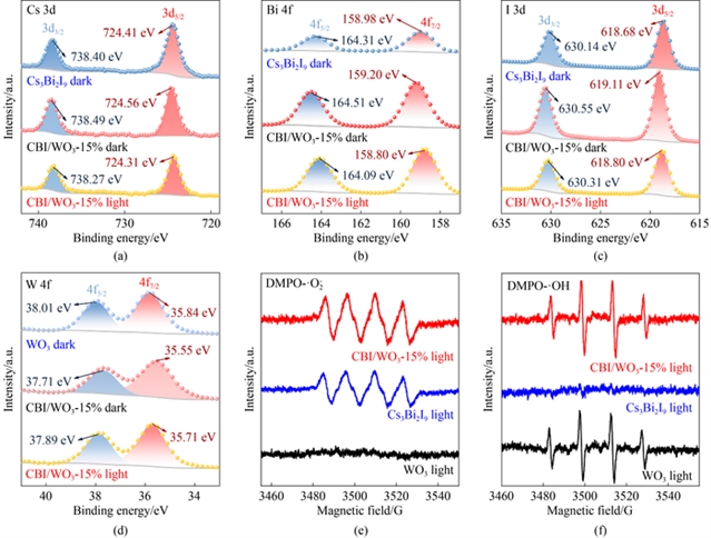 图5 (a) Cs 3d, (b) Bi 4f, (c) I 3d of Cs3Bi2I9与暗态下及光照下CBI/WO3- 15%的XPS光谱图;(d) WO3、暗态下的CBI/WO3- 15%以及光照下的CBI/WO3- 15%的W 4f能谱;光照下WO3、Cs3Bi2I9和CBI/WO3- 15%异质结的DMPO ESR对 (e) O2-和 (f) OH的自旋捕获图谱