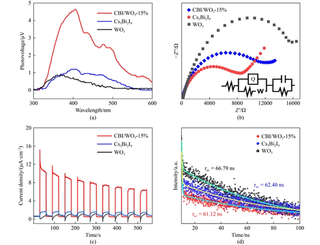 图6 (a) SPV光谱;(b) EIS及等效电路图;(c) 光电流响应谱(电流 - 时间曲线,i–t);(d) WO3、Cs3Bi2I9和CBI/WO3- 15%的TRPL光谱