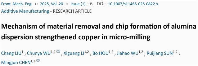 哈尔滨工业大学吴春亚和陈明君研究团队在《Frontiers of Mechanical Engineering》2025年第20卷第1期发表了题为“Mechanism of material removal and chip formation of alumina dispersion strengthened copper in micro-milling”的研究论文。文章通过建立有限元模型和开展实验,研究ADSC在微铣削加工中的材料去除和切屑形成机制。