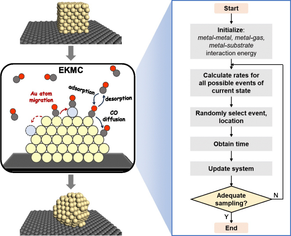 基于EKMC模拟方法,该研究发现:在高CO压强、高温条件下,Au纳米颗粒会脱离锐钛矿型TiO2(101)载体,发生“空中跳跃”,进而通过空中传质实现颗粒融合。完成空中融合的浮动颗粒在超越临界尺寸时,会重新沉积到载体表面。该现象源于高CO化学势环境下,小尺寸金颗粒的界面原子与CO的强相互作用,其作用力超过了颗粒-基底结合能。