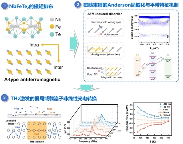 近日,中国科学院上海技术物理研究所红外科学与技术全国重点实验室胡伟达、陈效双、陆卫研究团队,联合中国科学院苏州纳米技术与纳米仿生研究所张凯研究员团队在反铁磁半金属弱局域增强的太赫兹探测取得突破,采用密度泛函理论和ARPES技术揭示了NbFeTe2中反相磁矩与电子自旋相互作用的物理过程以及反铁磁诱导Anderson局域化的微观机理,观察到载流子跳变诱导器件太赫兹响应率随温度降低的非线性增强现象,为针对不同应用场景下的宽温区高性能太赫兹探测器设计提供了新的视角。研究成果以“Antiferromagnetic semimetal terahertz photodetectors enhanced through weak localization”为题,发表在《自然·通讯》(Nature Communications)杂志上。