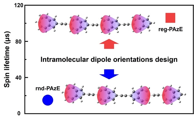 近日,中国科学院国家纳米科学中心研究员孙向南团队通过理论研究发现,分子半导体材料的分子内偶极取向能够影响超精细相互作用,而超精细相互作用强度是决定材料自旋寿命的关键因素。基于这一发现,该团队联合上海有机化学研究所研究员高希珂团队,基于具有相同元素组成与共轭结构平面性但分子内偶极排列不同的2,6-薁基共轭聚合物,结合电子顺磁共振技术和自旋阀器件,实验证明了通过设计分子内偶极取向可以显著抑制超精细相互作用,从而获得了高达106μs的室温自旋寿命,创造了室温纪录值。