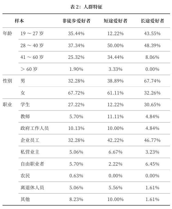 在具体人群构成上,非徒步爱好者的年龄在19~27岁、28~40岁、41~60岁三个年龄段中分布相对均衡,随着徒步距离增加,长途徒步的年轻化特征明显;男性受访者中长途爱好者居多,女性中短途爱好者居多;在职业构成上:随着人群徒步参与程度增加,其中企业员工的占比稳定增加,政府工作人员以非徒步爱好者与短途爱好者居多,而学生以非徒步爱好者与长途爱好者居多。