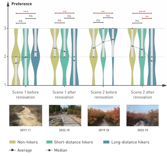 研究发现不同使用人群对两处山地步道改造存在偏好冲突:非徒步爱好者的评价均有提升,长途爱好者的评价均下降。这一分析结果说明,目前步道空间的改造更符合非徒步爱好者的偏好,并不符合徒步爱好者的偏好。