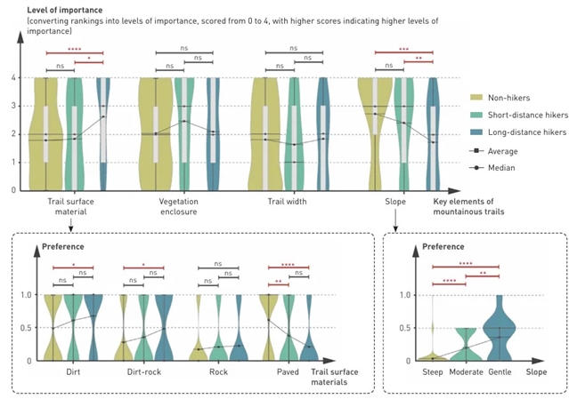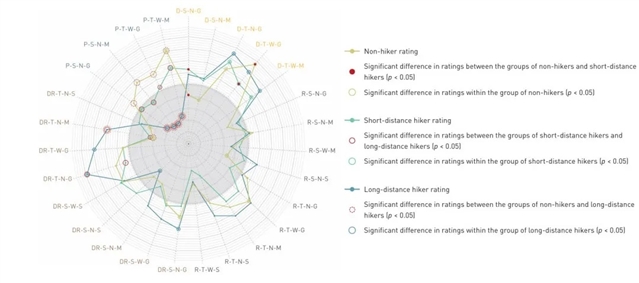 整体而言,三类人群集中偏向宽路与高大乔木空间。深入挖掘坡度与道路材质的偏好差异:非徒步爱好者与短途爱好者偏好缓坡,长途爱好者偏好中坡。在道路材质偏好方面,非徒步爱好者、短途爱好者、长途爱好者对铺装类步道的偏好依次下降、对自然道路(土路、土石路、石头路)的偏好依次上升,长途爱好者对铺装道路的偏好显著低于另两类人群,且他们对土路类与土石类步道的偏好显著高于非徒步爱好者。