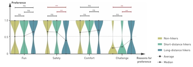 三类人群偏好差异的主要原因是对安全性和挑战性的需求不同。此外,所有人群都很注重趣味性和舒适性。相对而言,徒步爱好者对步道空间的趣味性和舒适性要求更高。虽然三类人群对安全性和挑战性的关注存在较大差异,但都首要关注坡度要素带来的体验差异。