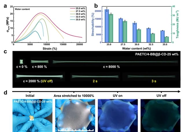 图2 PAETC/4-BB@β-CD水凝胶的力学性能:(a)不同含水量的PAETC/4-BB@β-CD水凝胶的真实应力-应变曲线;(b)不同含水量的水凝胶的拉伸性能和韧性;(c) PAETC/4-BB@β-CD-25 wt%水凝胶在拉伸过程中的RTP性能;(d) PAETC/4-BB@β-CD-25 wt%水凝胶经过双轴拉伸至10000%的面积应变以及拉伸后的磷光性能
