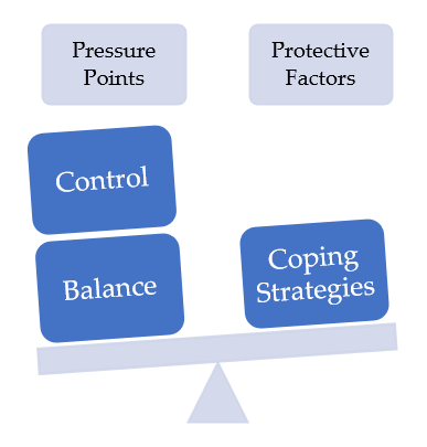 通过定性分析得出三个主要影响因素:平衡、控制和应对。图1展示了压力源与应对机制之间的平衡。天平的一侧代表影响机构内研究生心理健康和福祉的压力点,而另一侧则反映了涵盖研究生为恢复控制感和平衡感而采用的应对策略的保护性因素。