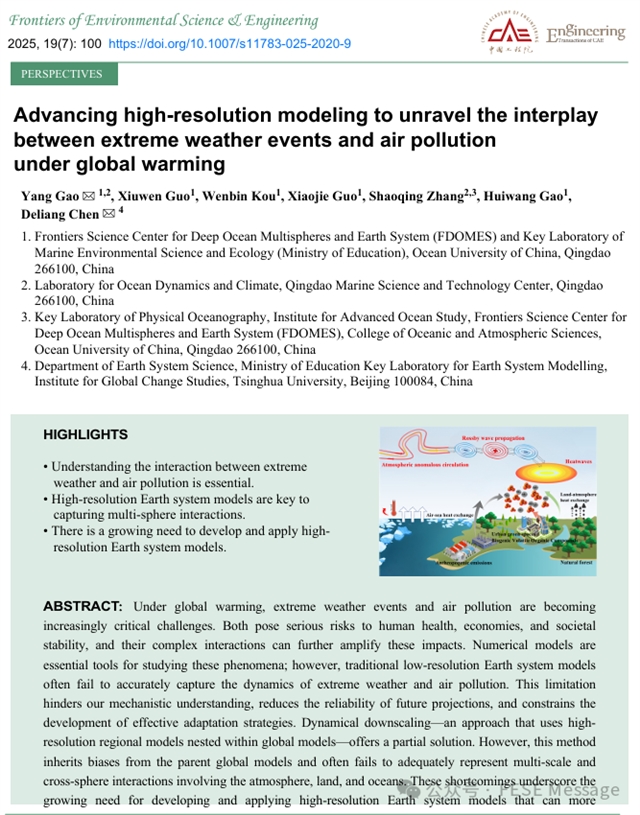 近日,清华大学陈德亮院士和中国海洋大学高阳教授团队在FESE期刊第19卷第7期发表了题为“Advancing high-resolution modeling to unravel the interplay between extreme weather events and air pollution under global warming”的展望论文。