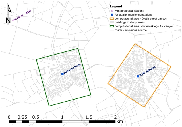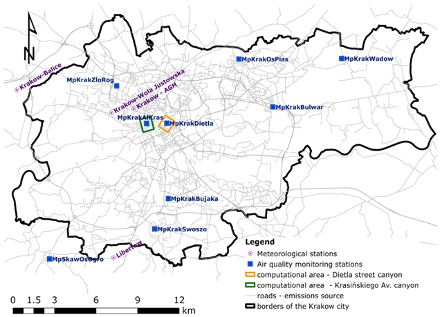 研究区域——克拉科夫市 (波兰) 的空气质量监测站和气象站的位置,并计算区域标记。