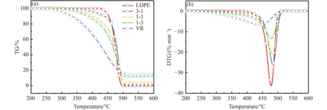动力学研究发现,随着VR比例的增加,共热解的平均活化能从LDPE的225.92 kJ·mol-1降至VR占75%时的161.41 kJ·mol-1,说明共热解体系的反应活性随VR比例提升而增强,这与LDPE分解产生的自由基引发的VR裂解密切相关。