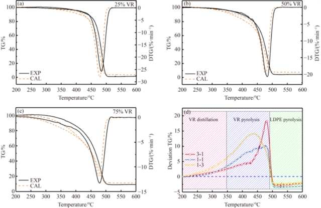 本研究揭示了VR各SARA组分与LDPE的作用差异,明确了共热解协同效应的温度-比例调控规律及动力学特征,为VR与塑料共处理技术的优化提供了理论依据,同时为塑料废弃物的资源化利用与重质油高效转化的协同实现提供了新路径。