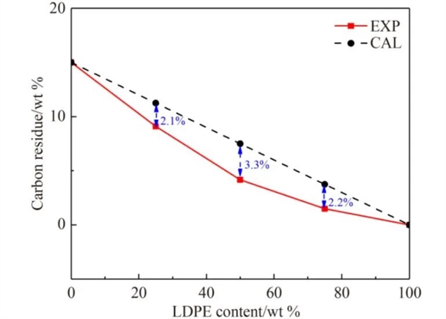 实验结果表明,LDPE与VR共热解存在显著的温度和比例依赖性负协同效应——在200–450 ℃,LDPE的熔融特性阻碍了VR的挥发组分释放,导致重量损失减少,但在480 ℃以上,LDPE分解产生的氢质子促进了VR重组分的裂解,负效应转为正效应,残炭生成量显著低于理论值。SARA组分分析显示,沥青质和胶质作为VR中的重组分,与LDPE的相互作用最强,其共热解残炭的降低幅度最大,表明LDPE的氢供体作用主要针对VR中的高生焦组分。SARA组分的热解特性显示,其表观裂解活性按饱和组分 > 芳香组分 > 胶质 > 沥青质的顺序递减,而共热解实验与计算曲线的对比进一步验证了重组分与LDPE之间存在强相互作用。此外,SARA组分与LDPE共热解的重量偏差值随温度变化的规律,与LDPE对重组分的氢供体促进作用一致。