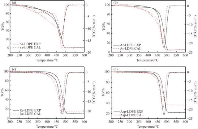 图5 10 ℃·min-1升温速率下SARA组分与LDPE 1:1混合样品的实验与计算TG-DTG曲线对比