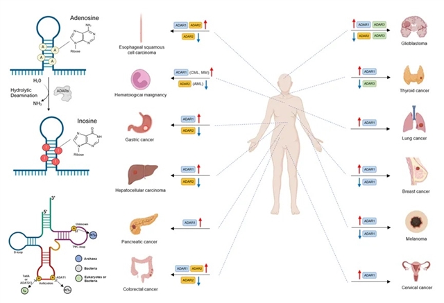 1. 癌症中的A-to-I编辑:A-to-I RNA编辑在癌症的发生和发展中发挥着重要作用。A-to-I编辑的异常水平与癌基因和肿瘤抑制基因的调控相关,从而促进了肿瘤的形成。