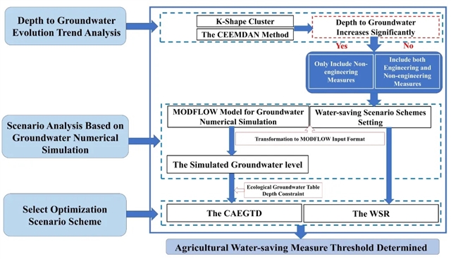 本研究构建了方法框架并确定关键参数。首先,运用k-Shape聚类算法对11口观测井的DTG时间序列数据聚类,结合CEEMDAN方法分解DTG变化趋势。其次,基于MODFLOW建立地下水数值模型,模拟12种节水情景对地下水埋深的影响。最后,以生态地下水位控制面积 (CAEGTD) 和缺水率 (WSR) 为优化标准,确定节水措施最优阈值。关键参数包括生态地下水位阈值 (EGTD),如作物生长期 (5-8月) 为1.2-1.8米,以及涵盖工程与非工程措施的节水情景设计。