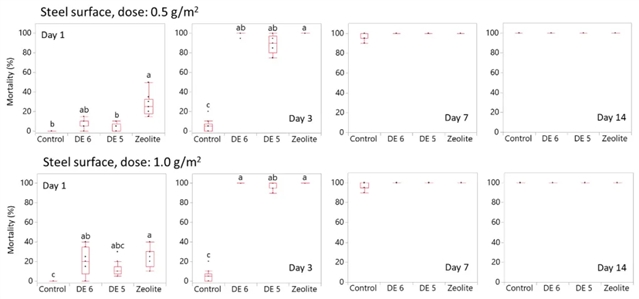(1) 研究了源自希腊的天然硅藻土和沸石粉尘在混凝土和钢材表面上对储粮害虫的杀虫效果,弥补了此前缺乏直接施用于不同表面的杀虫效果评估的研究空白。
