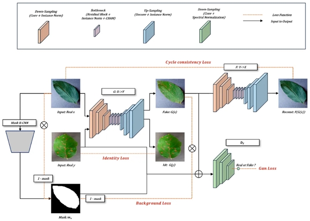 (1) 提出了一种基于图像到图像转换模型的数据增强方法,创新性地通过健康和病变叶片图像之间的转换生成更多逼真的病叶图像。