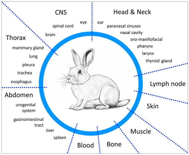 按身体部位和器官分组的VX2肿瘤兔模型的描绘。