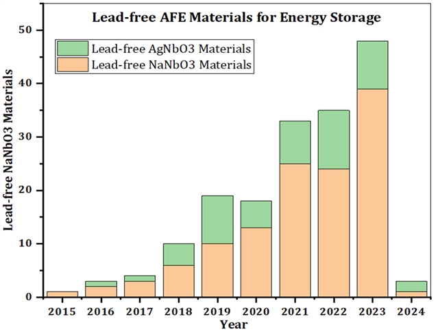 截至目前,AgNbO3和NaNbO3被认为是无铅反铁电材料的代表。图2展示了从2015年到2024年在Scopus索引期刊上发表的关于用于储能的无铅反铁电材料的学术论文数量。从图中可见,关于NaNbO3的学术论文数量更多。这是由于NaNbO3的合成和加工过程比AgNbO3更具成本效益,原材料较便宜并且在烧结过程中不需要保护性气氛。