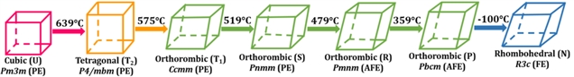 NaNbO3具有复杂的晶体结构,在不同温度下呈现多种相态,如图4所示。其中,P相 (反铁电) 和Q相 (铁电) 在低温下能量水平相近。纯NaNbO3通常不表现出稳定的双极化电滞回线,这与其他反铁电材料如PbZrO3或AgNbO3不同。影响NaNbO3相稳定性的因素包括化学组成、起始原料和晶粒尺寸等。研究者通过化学改性,如掺杂和固溶体,试图稳定反铁电相并实现双极化电滞回线。这些改性策略主要通过调节容忍因子和极化率来影响相稳定性。此外,非公度相的存在被认为在电场诱导的反铁电-铁电相变中起关键作用。总的来说,NaNbO3基材料的相操控和性能优化仍是当前研究的重点和挑战。