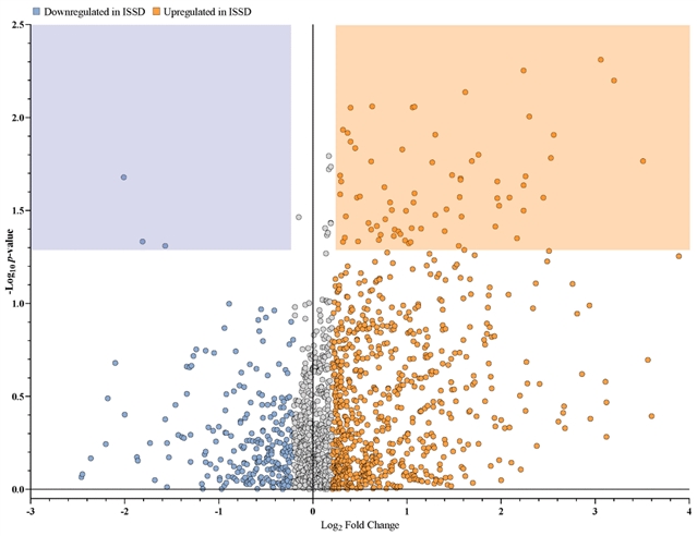 图1. ISSD参与者粪便样本中代谢物的上调和下调。图中每个数据点代表一个单一的代谢物,x轴表示ISSD参与者下调 (蓝色) 和上调 (橙色) 代谢物之间的平均相对变化或倍数变化。y轴表示每种代谢物相对变化的p值。橙色和蓝色区域分别代表ISSD组中显著上调和下调的代谢物。灰色数据点表示没有显著差异的代谢物。研究通过非靶向LCMS分析了INSD和ISSD参与者的粪便样本,发现了19502种化合物,其中1451种被鉴定为不同的代谢物,在这些代谢物中,ISSD组有82种显著上调,3种显著下调。