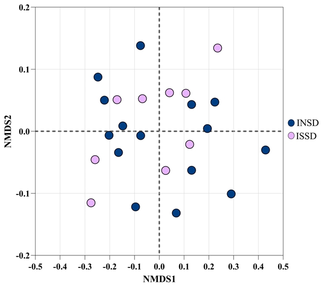 图2. INSD和ISSD参与者Bray-Curtis相异性的非度量多维尺度。深蓝色和紫色点分别代表INSD和ISSD参与者。研究发现两组的样本几乎均匀地分布在图的中心,表明这两组的代谢物谱没有显著差异。方差分析统计检验证实,两个研究组的代谢物谱没有显著差异 (p > 0.05)。